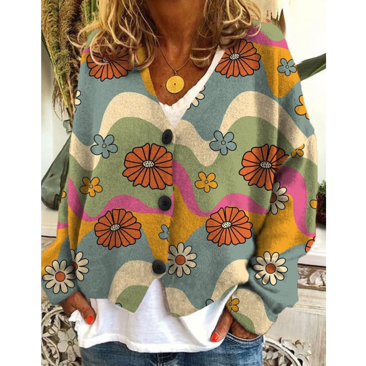 Dámský svetrový kardigan s květinovým vzorem